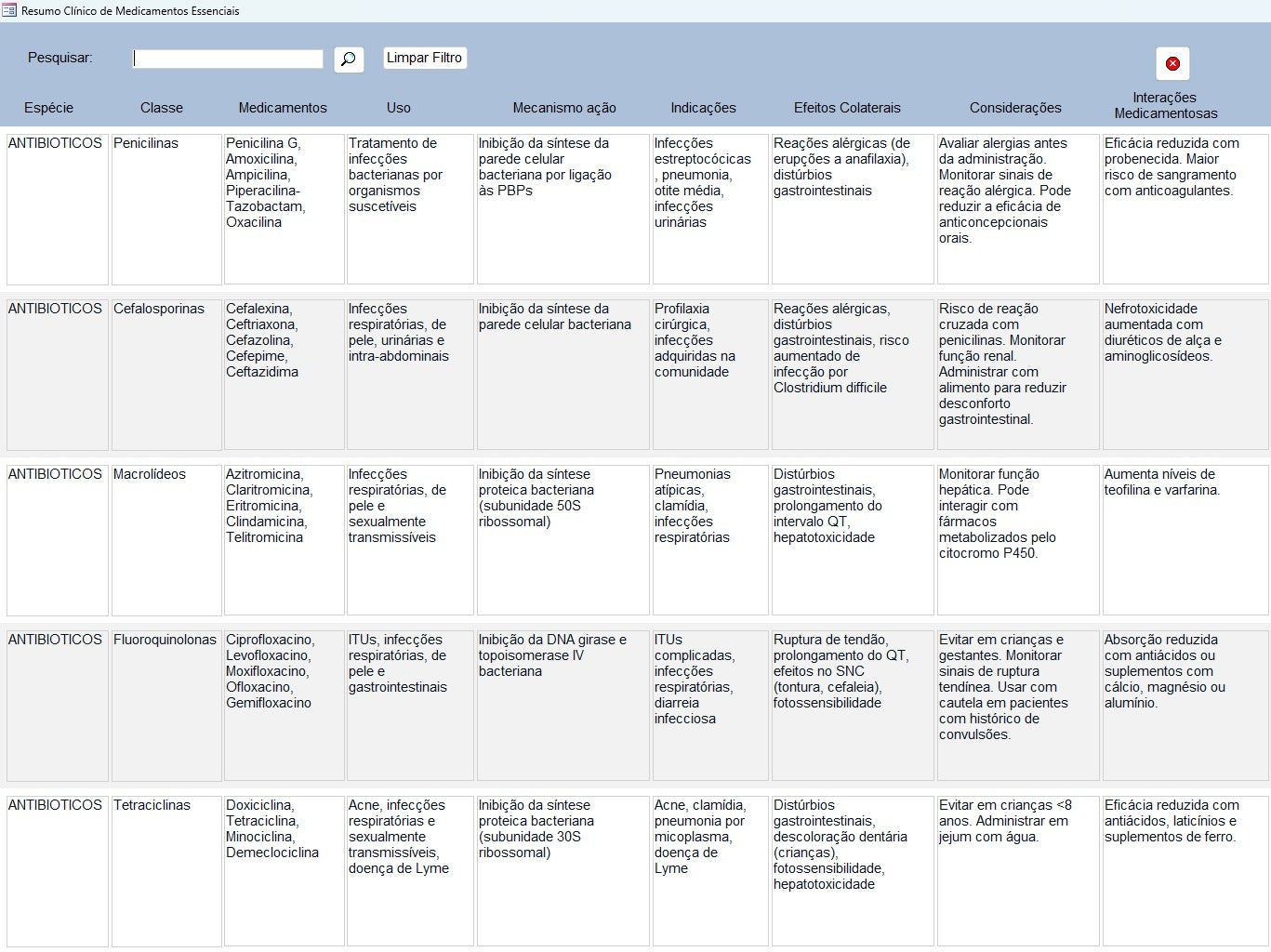 • Access (formulário navegável com filtros por classe, uso, fármaco ou efeito)